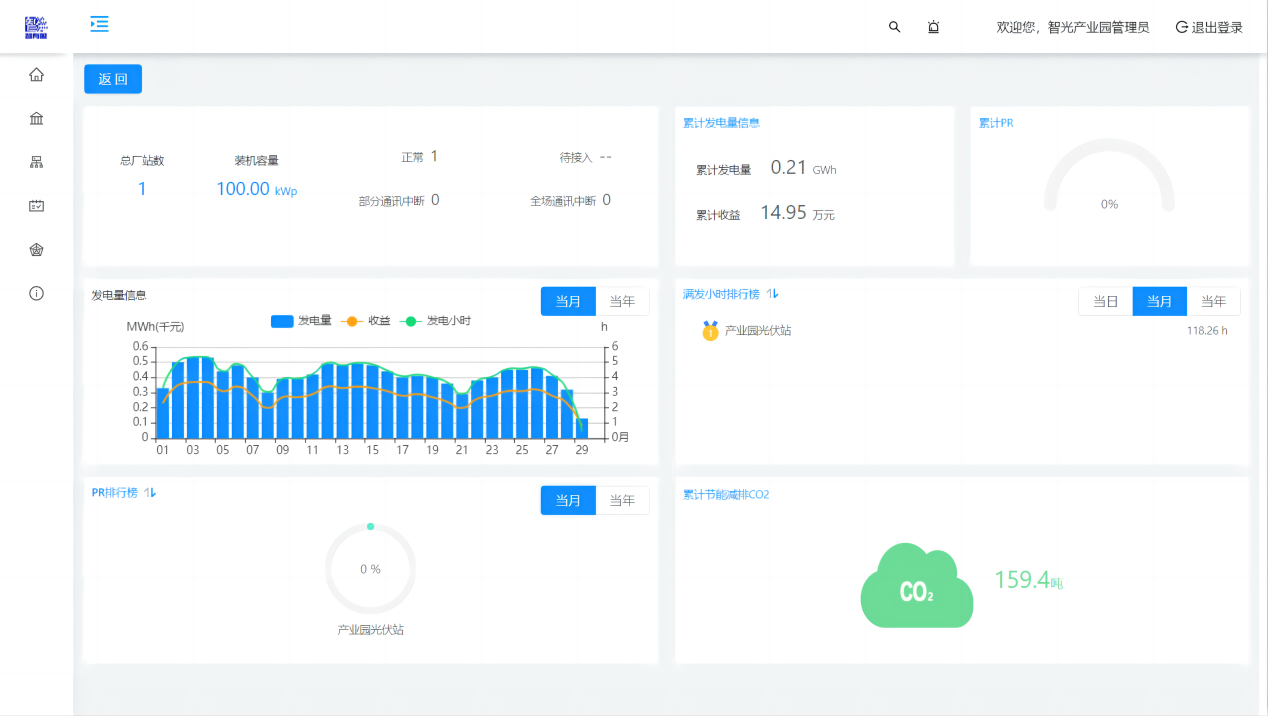 光伏运营系统按功能划分为综合数据大屏和电站管理两种平台展示,可分别通过web端和移动端同步访问。其中电站管理平台主要功能包括电站设备数据展示、告警管理、报表统计等。