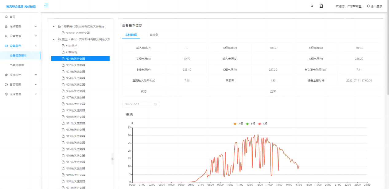 展示电站对应的设备信息实时数据,逆变器交流电流、电压、功率的统计汇总曲线,直流侧电压电流监测,以及气象站风速、温湿度、辐射、压力的数据曲线。